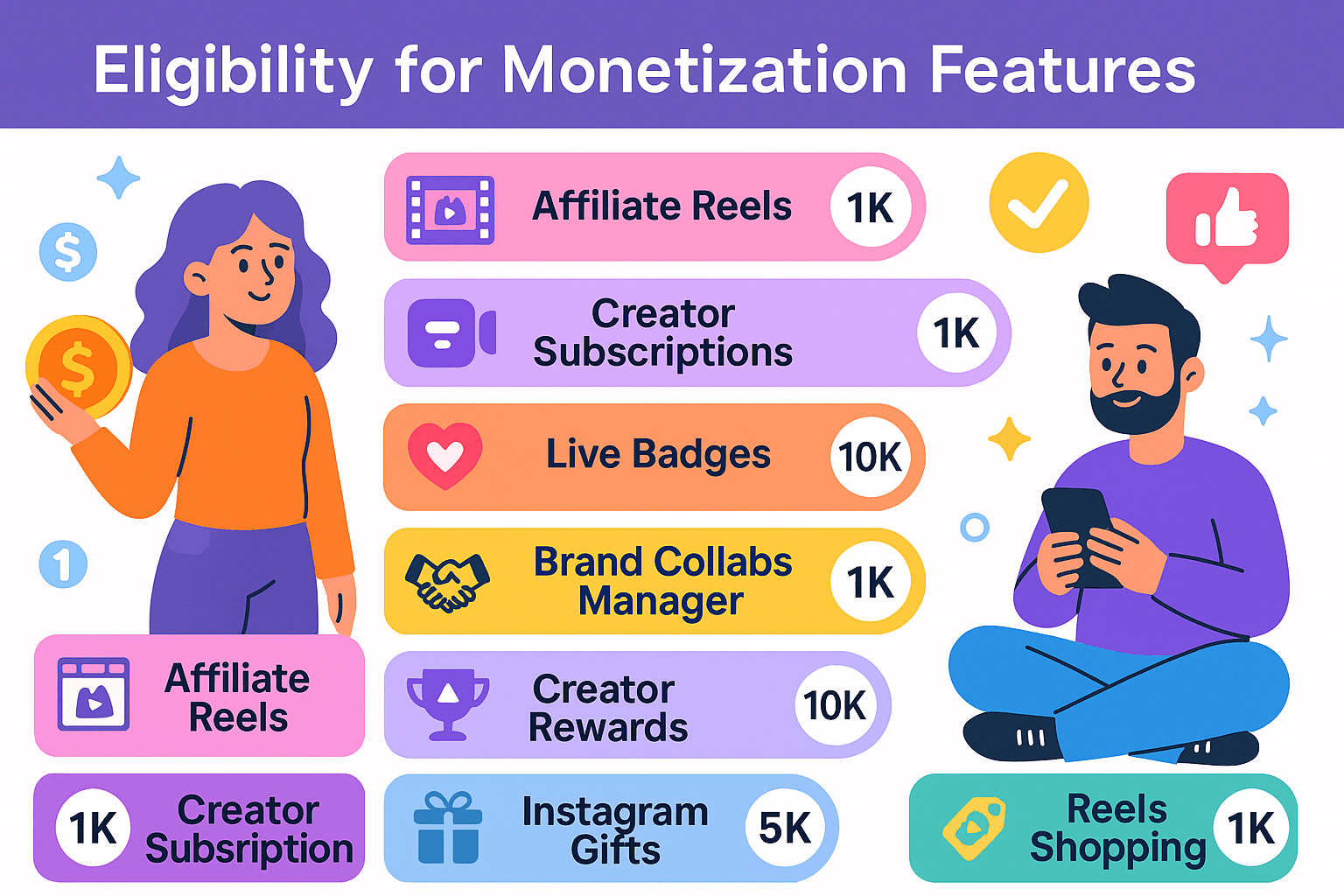Each monetization feature on Instagram unlocks progressively based on your activity, authenticity, and size: