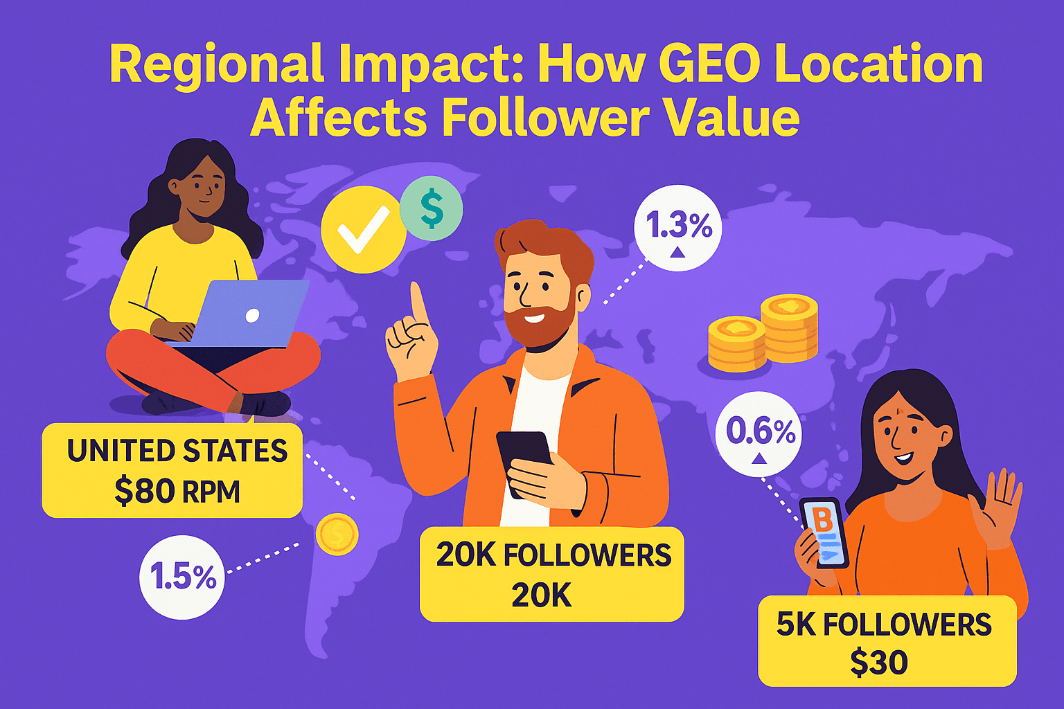Instagram calculates monetization performance using advertiser region value, engagement rate, and purchasing behavior. A creator with 2,000 U.S.-based followers can earn more than one with 10,000 followers from low-CPC regions if engagement and buying power are higher.