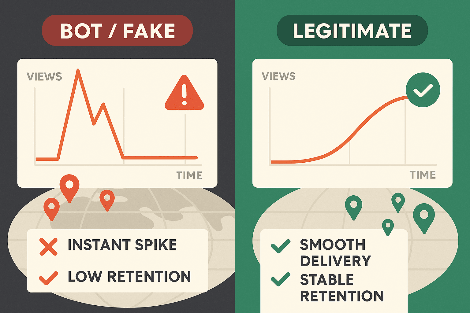To compare retention by source and style, use the evaluation framework in which TikTok views really help. It breaks down human vs. bot signals, GEO mixes, and delivery curves.