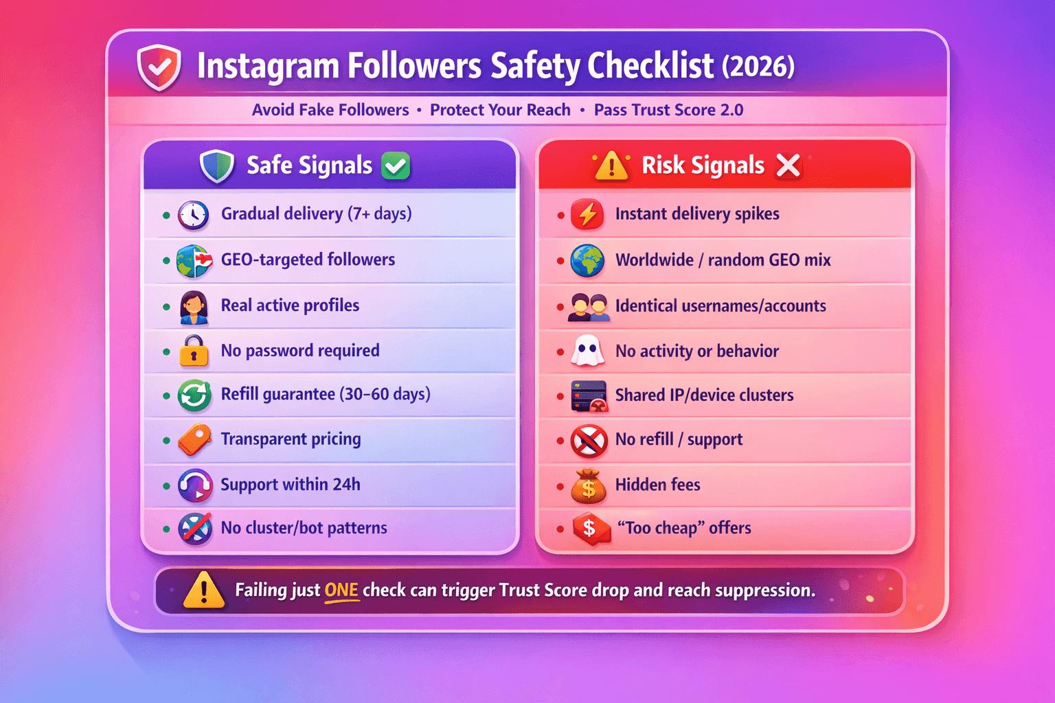 For Instagram specifically, SMMNut’s research confirms that follower services producing outcomes below the SMMNut Safety Verification Checklist criteria consistently result in trust score tier drops and regional signal corruption. Services that use gradual GEO-targeted delivery from real-profile source accounts produce stable outcomes across all five of Instagram’s 2026 detection dimensions.