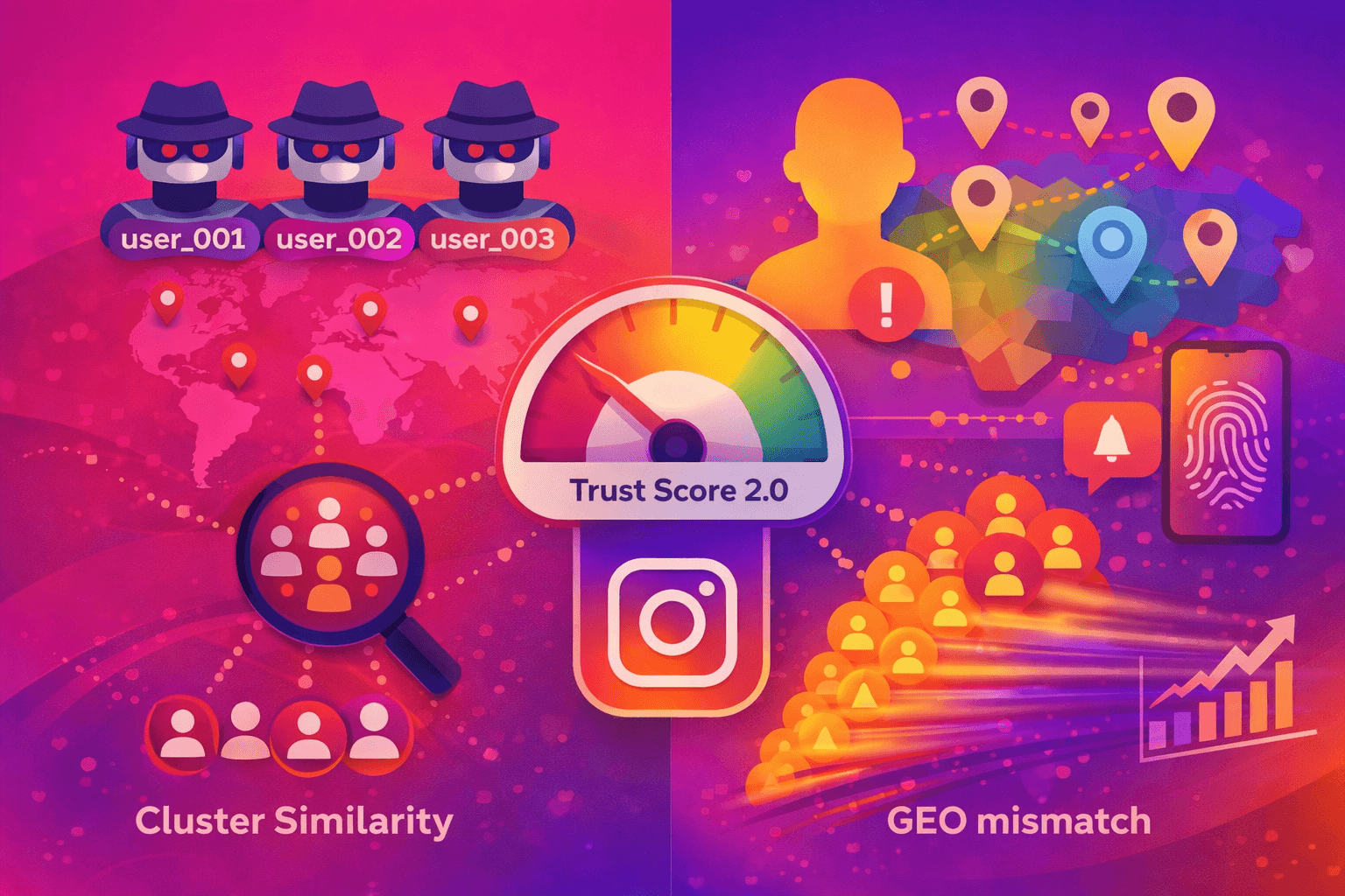 A fake Instagram follower in 2026 is any account that fails Instagram’s Trust Score 2.0 evaluation criteria — regardless of whether it is a bot or a real human. Instagram’s 2026 detection system evaluates followers across five dimensions: behavioral session activity (scrolling, watch time, interaction patterns), GEO region accuracy (whether the follower’s location matches the creator’s target audience), follower acquisition velocity (how quickly new followers arrive), cluster similarity (shared usernames, IP ranges, or creation dates), and device fingerprint consistency. An account that fails any of these criteria is treated as a low-trust or fake signal, even if it has a profile photo and posts. This expanded definition means that real humans from the wrong country — or real accounts delivered too quickly — are algorithmically equivalent to bots under the 2026 system.