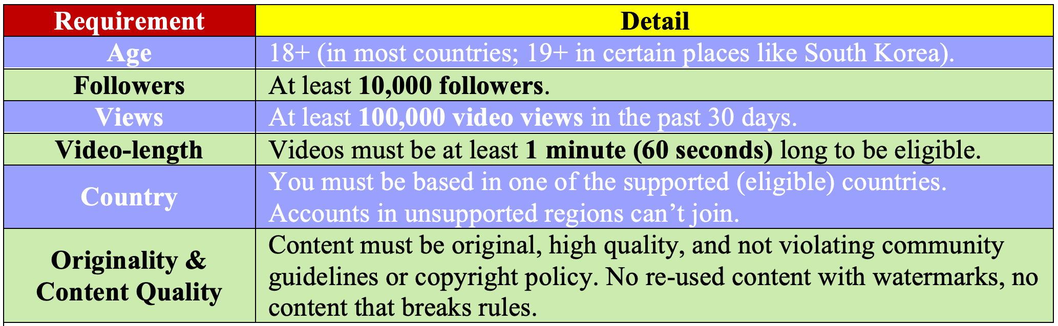 The eligibility rules (10K followers, 100K views, 60-second videos) are stricter but also clearer. You know exactly what you need to hit, unlike the vague system before. - Focus on Quality Content