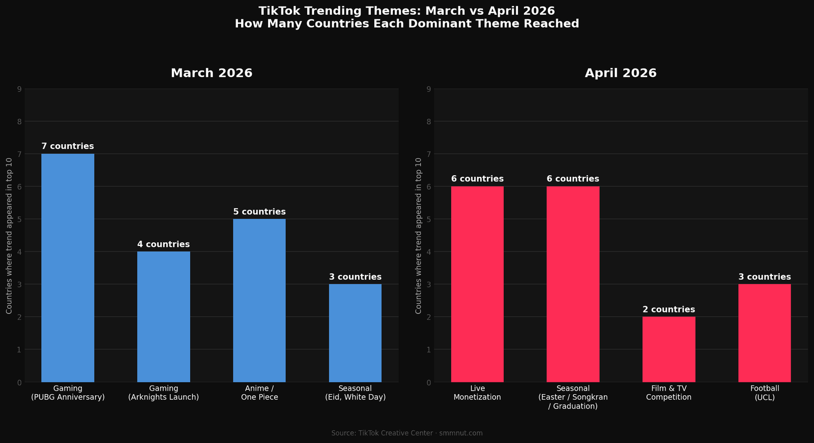 For creators and researchers tracking TikTok trends across reporting periods, the key changes from March 2026 to April 2026 are as follows: gaming content (PUBG anniversary, Arknights) has largely exited the global top 10 and most regional lists, replaced by a combination of live monetization creator content, spring seasonal material, and local cultural moments. The structural dominance of gaming in March 2026 was event-driven and has resolved as expected. The live monetization trend that has replaced it as the leading cross-regional signal is behavior-driven and is likely to continue accumulating through Q2 2026.