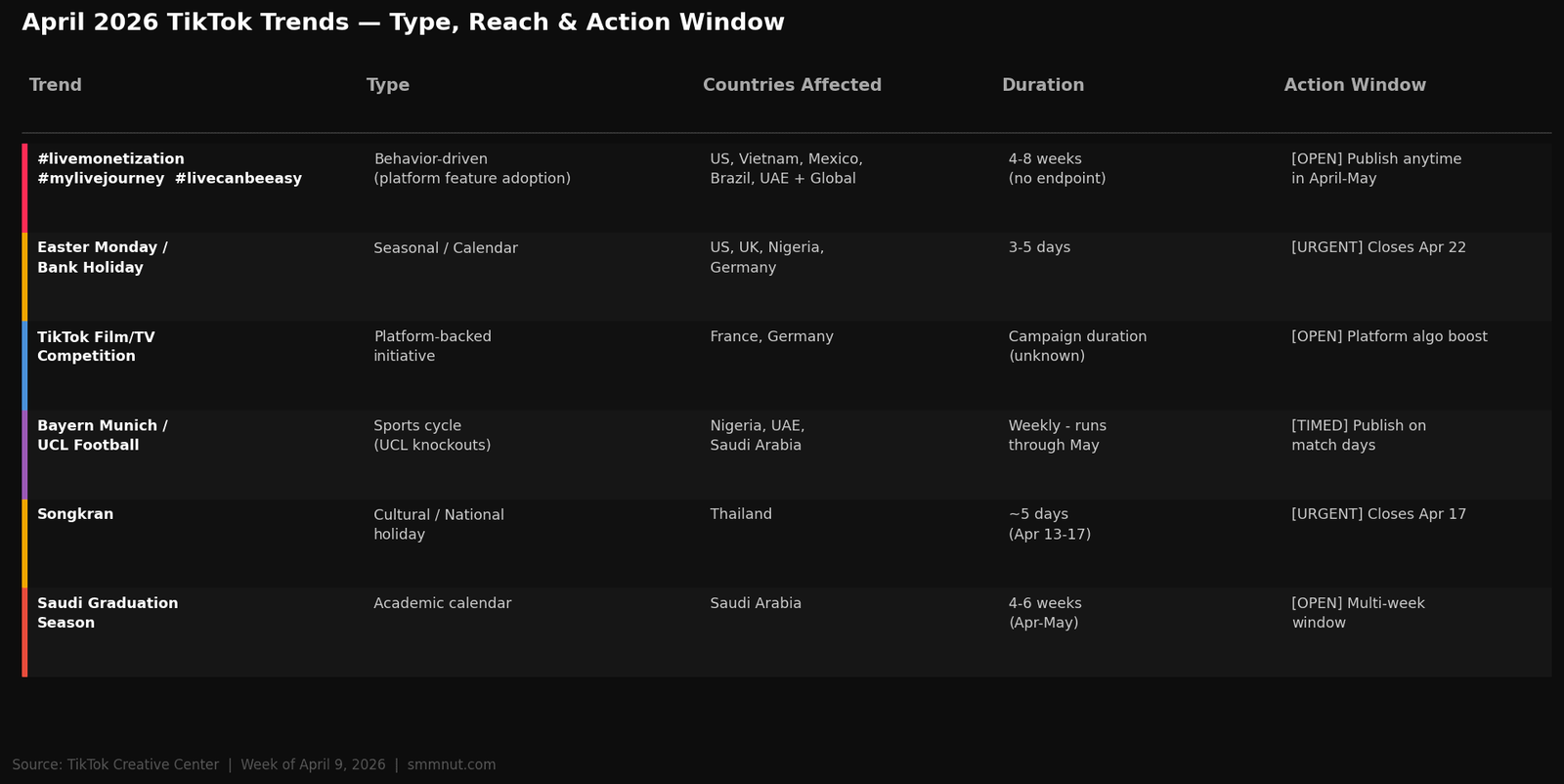 - Regional-only trends: Saudi graduation season (April–May), Japanese new school year content, Thai Songkran location hashtags, Filipino and Mexican creator-specific moments