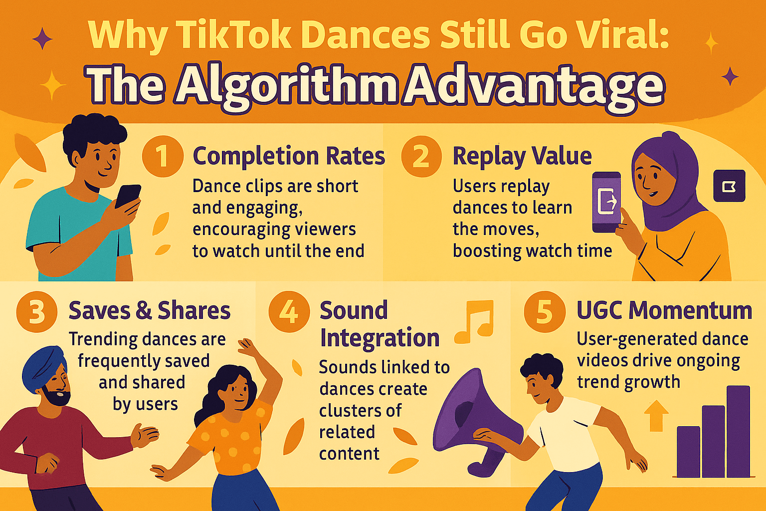 Dance trends succeed on TikTok not because they’re special — but because they’re perfectly aligned with how the platform measures engagement. Completion, replays, saves, shares, and sound clustering all work in their favor, making them the easiest type of content to go viral.
