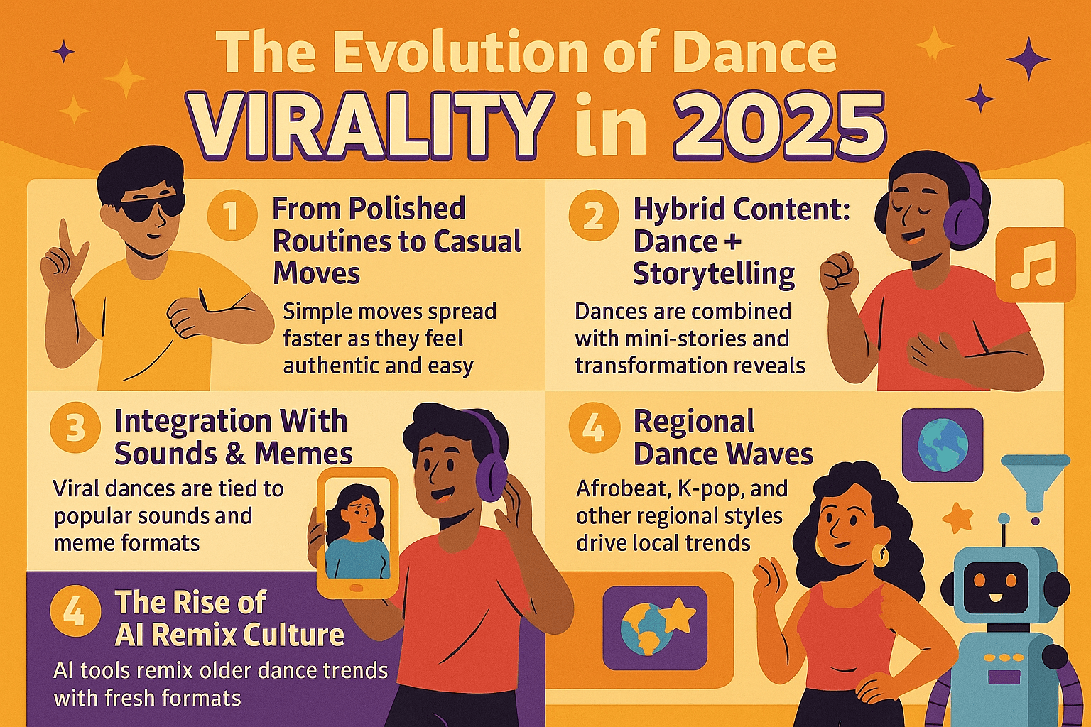 Dance virality in 2025 has evolved from polished choreography → casual authenticity → hybrid storytelling → cultural remixing with AI. This evolution keeps dances relevant in TikTok’s fast-changing ecosystem, proving why they’re still one of the platform’s most reliable growth engines.